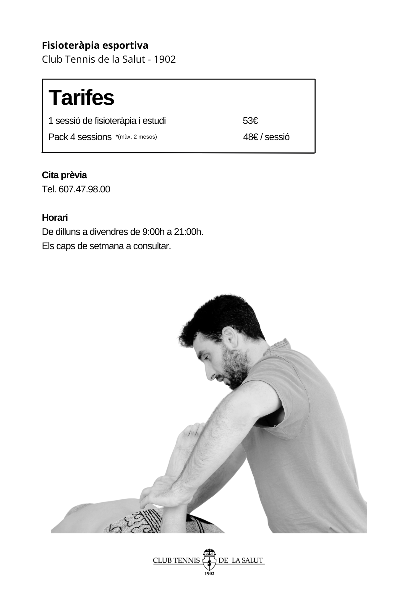 La fisioteràpia esportiva que oferim al Club està enfocada a la prevenció i tractament de lesions derivades, principalment, de l’activitat física. L’objectiu és optimitzar el rendiment, afavorir una recuperació segura i prevenir recidives. Treballem mitjançant tècniques manuals, exercicis terapèutics, tecnologia específica i teràpies adaptades a les necessitats de cada persona independentment del motiu de la lesió.